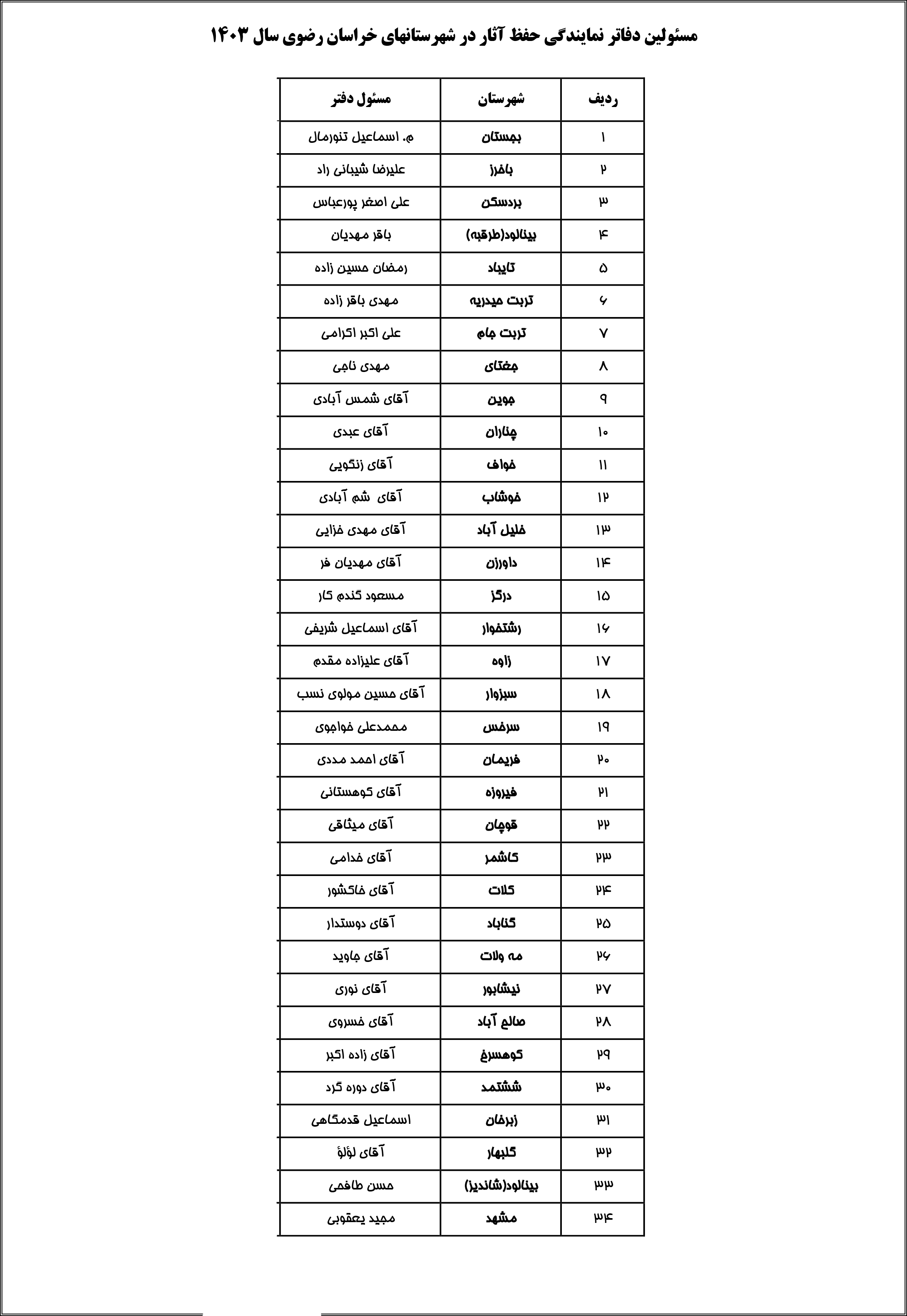مسئولین دفتر نمایندگی حفظ آثار و نشر ارزش های دفاع مقدس خراسان رضوی در شهرستان های خراسان رضوی سال 1403